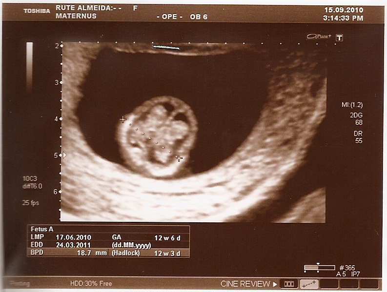 Com 12 semanas de gestação, o bebê chega nos seus 5 a 6 centímetros de comprimento. Por isso neste período, a ecografia obstétrica do 1º trimestre deve ser realizada entre as onze e treze semanas e 6 dias. É através desta ecografia que se pode avaliar toda a anatomia fetal, podendo-se detetar prematuramente algumas malformações.