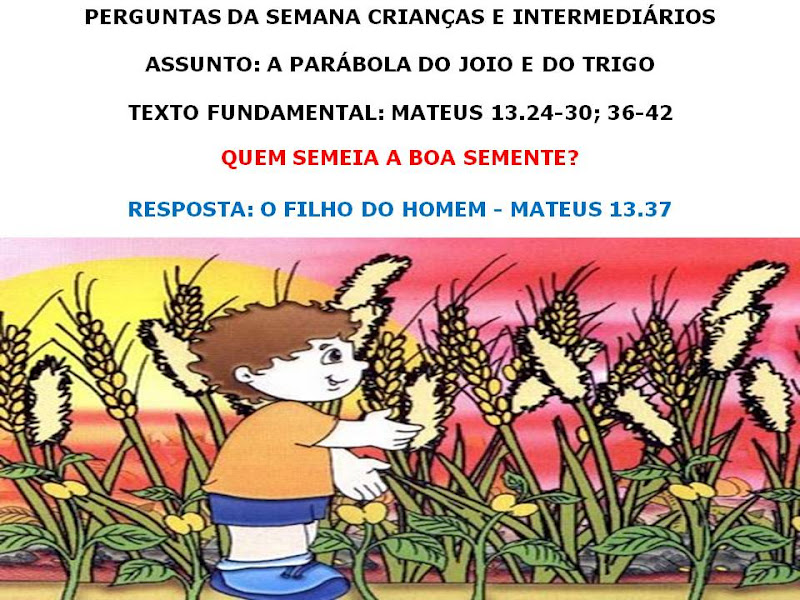 Mateus 13:24-30. 24 Jesus lhes contou outra parábola, dizendo: "O Reino dos céus é como um homem que semeou boa semente em seu campo. 25 Mas enquanto todos dormiam, veio o seu inimigo e semeou o joio no meio do trigo e se foi. 26 Quando o trigo brotou e formou espigas, o joio também apareceu. 27 "Os servos do dono do campo dirigiram-se a.