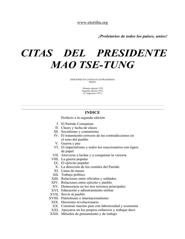 Citações do Presidente Mao Zedong Mao Zedong 1966. Citações de: 1926 a 1964. Tradução: A presente tradução está conforme as Edições em Línguas Estrangeiras de 1972 publicadas em Pequim. Transcrição e HTML: Lucas Schweppenstette. Índice. I. O Partido Comunista. II. As classes a luta de classes.