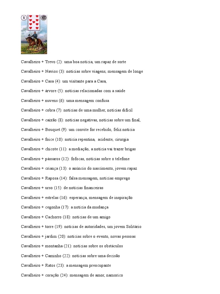 Combinações de Cartas Lenormand/Baralho Cigano 24. Coração 24. Coração + 1. Cavaleiro - Novo amor. - Mensagem apaixonada. - Encontro importante e significativo. 24. Coração + 2. Trevo - Afortunado no amor. - Afeição afortunada. 24. Coração + 3. Navio - Relacionamento de longa distância. - Viagem romântica. - Lua de mel.