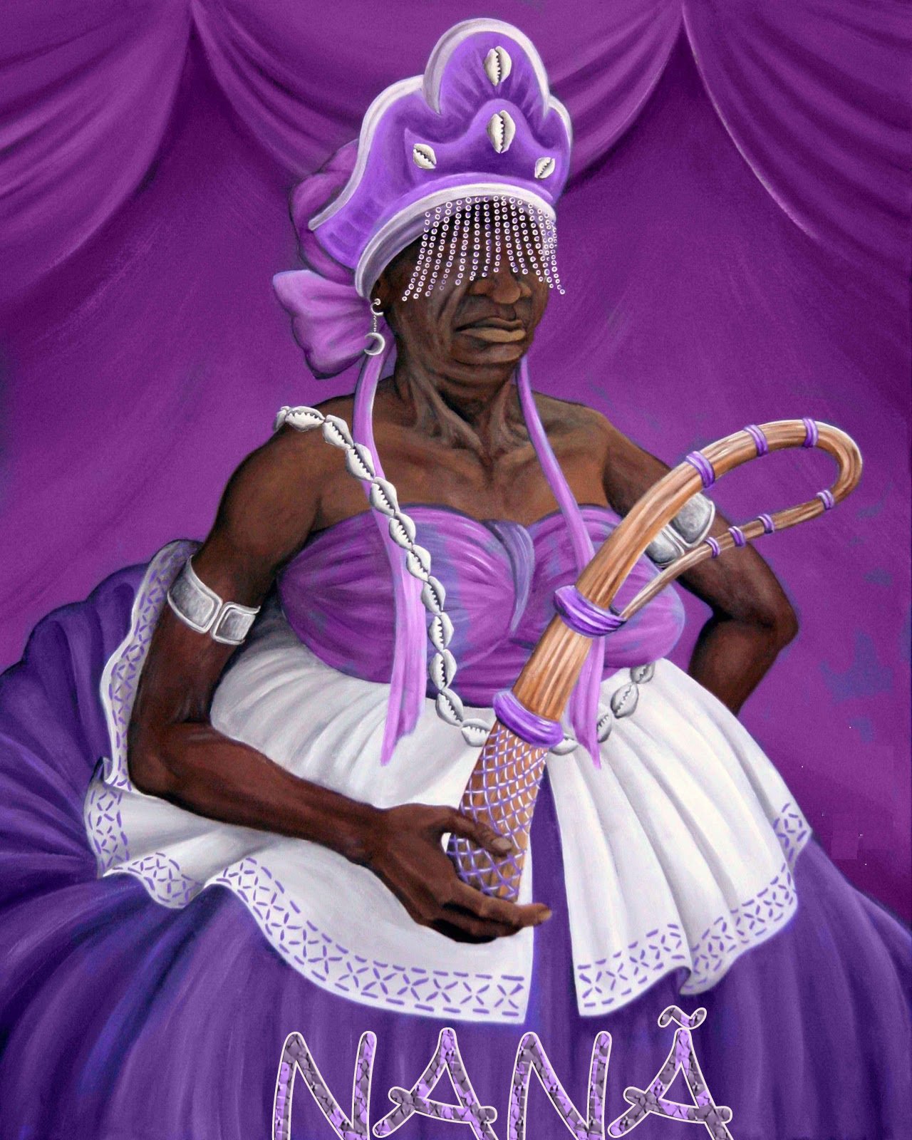 Cores: marrom, cor palha. Dia da semana: Segunda-feira. 5. Nanã Buruku - a mais velha dos orixás, primeira esposa de Oxalá, deusa da morte. Saudação: Saluba Nanã! Cores: lilás, roxo. Dia da semana: Domingo. 6. Oxumaré/Bessen - O orixá da riqueza representado pelo arco-íris e pela cobra.