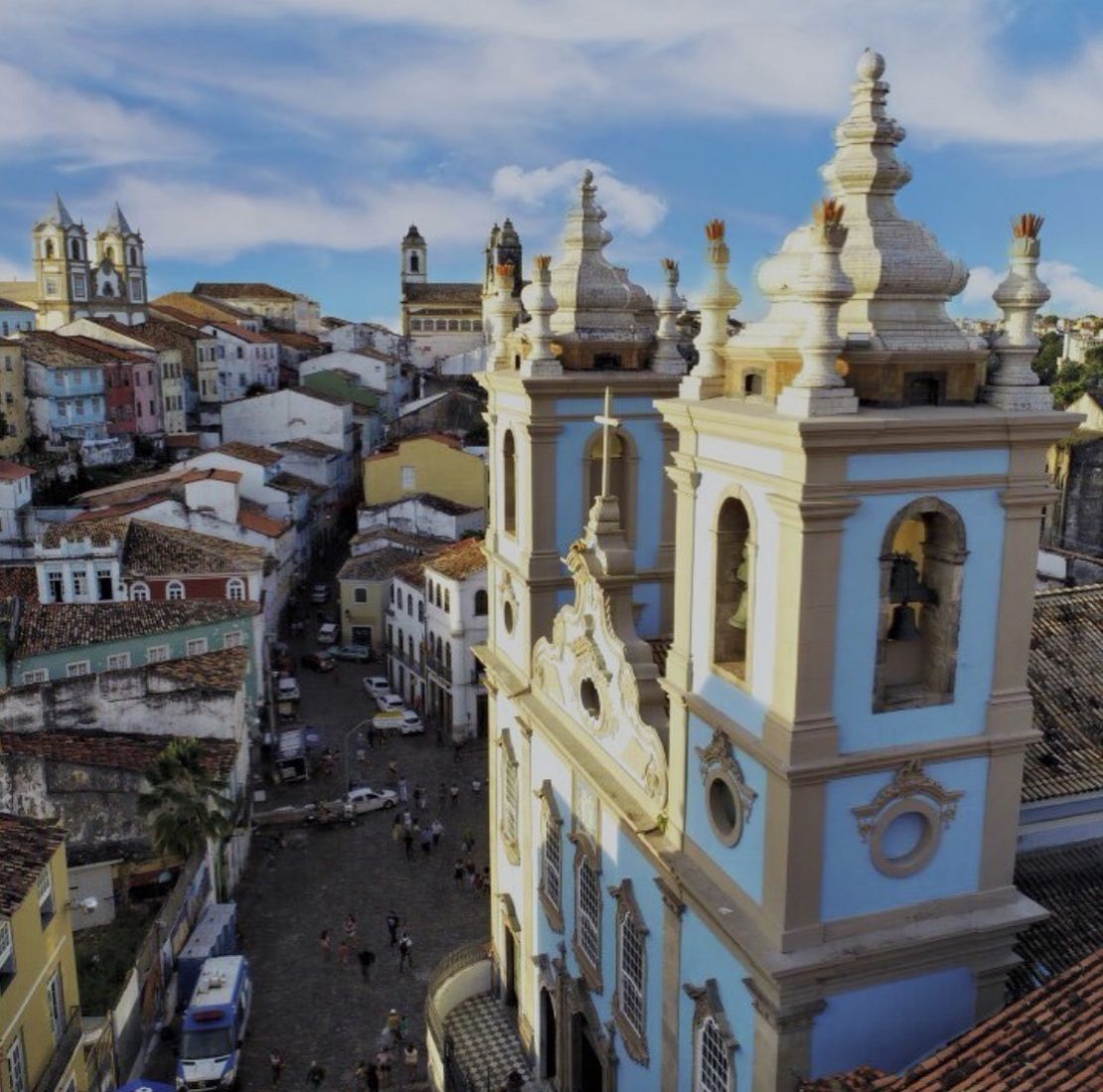 Meimoa-ponte. (3) Uma referência do Pelourinho, em Salvador, Bahia, a Igreja Nossa Senhora do Rosário dos Pretos se destaca do conjunto de casas coloridas com a chamativa cor azul da fachada de arquitetura colonial e rococó que remete ao século XVIII. A igreja construída por iniciativa dos escravos, membros de uma das primeiras irmandades.