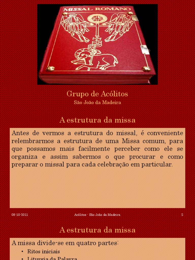 2 Os direitos deste missal pertencem à Paróquia de São Nicolau, Lisboa. (Texto das rúbricas e traduções para português adaptados do Missal Quotidiano e Vesperal , Bruges, Bélgica, 1957.)