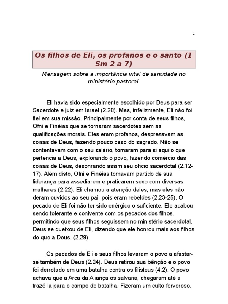 Note que raramente a Bíblia é tão explicita em identificar pessoas maldosas como acontece com os filhos do sacerdote Eli. Tudo começou quando Eli que era sacerdote em Israel escolheu seus filhos para administrar o templo e nesse quesito os filhos de Eli se destacaram por contra do enorme mau testemunho.. Sem mais delongas vamos aprender e obter novas revelações contidas no esboço de.