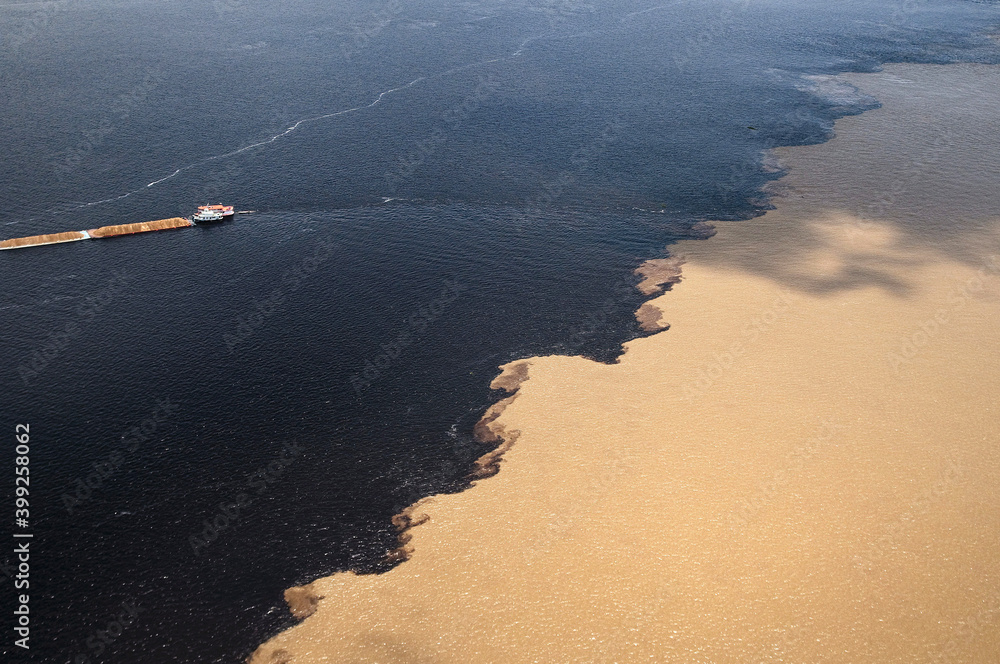 Vista aérea do encontro das águas do rio Solimões, água clara e rio Negro, água escura em Manaus