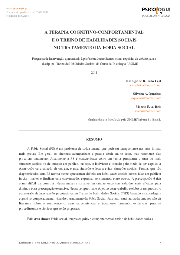 (PDF) A TERAPIA E O TREINO DE HABILIDADES SOCIAIS NO TRATAMENTO DA