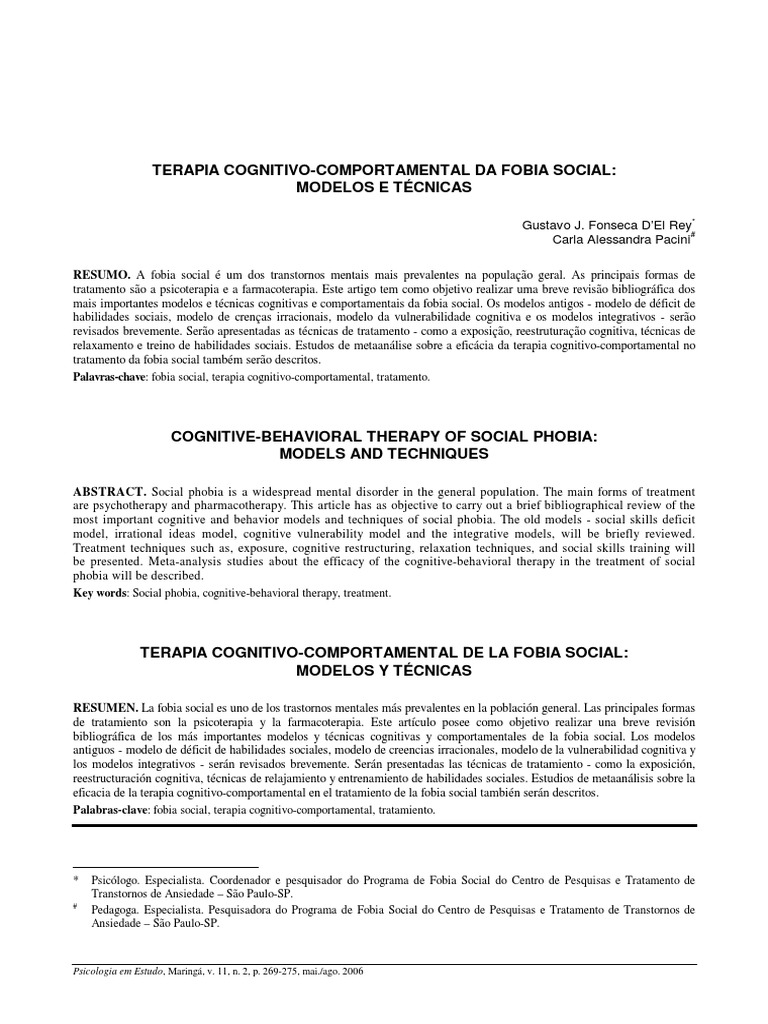 Cognitive-behavioral therapy of social phobia: models and techniques (Terapia cognitivo-comportamental da fobia social: modelos e técnicas) August 2006 Psicologia em Estudo 11(2):73-81