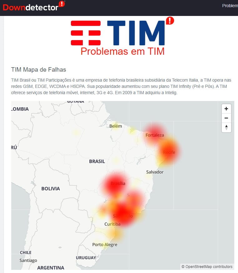 Mapa de falhas e interrupções no serviço TIM. O seguinte mapa de interrupções mostra as áreas mais recentes em Brasil onde usuários do serviço TIM relataram estar tendo problemas e interrupções. Se você estiver tendo problemas com o serviço TIM e seu local não estiver listado, não deixe de enviar uma reclamação abaixo.
